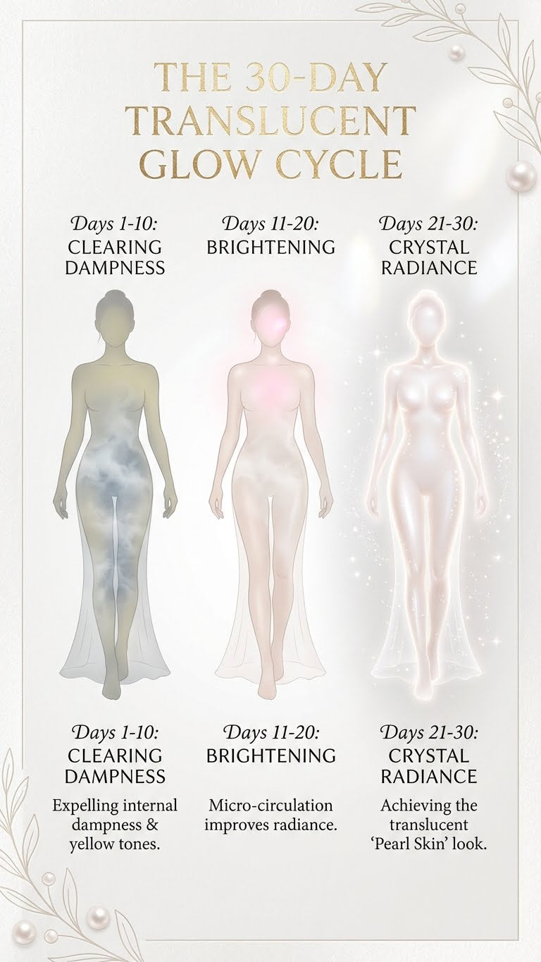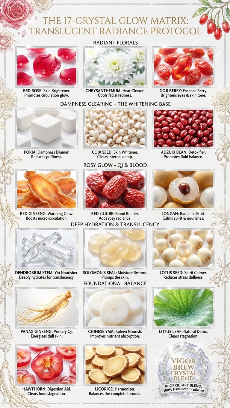 The Crystal Glow Ritual™ is our most complex formulation yet. By combining powerful dampness-clearing botanicals (Pearl Barley, Poria) with elite skin-nourishing roots (Dendrobium, Ginseng), we create a "whitening filter" that works from the inside out.